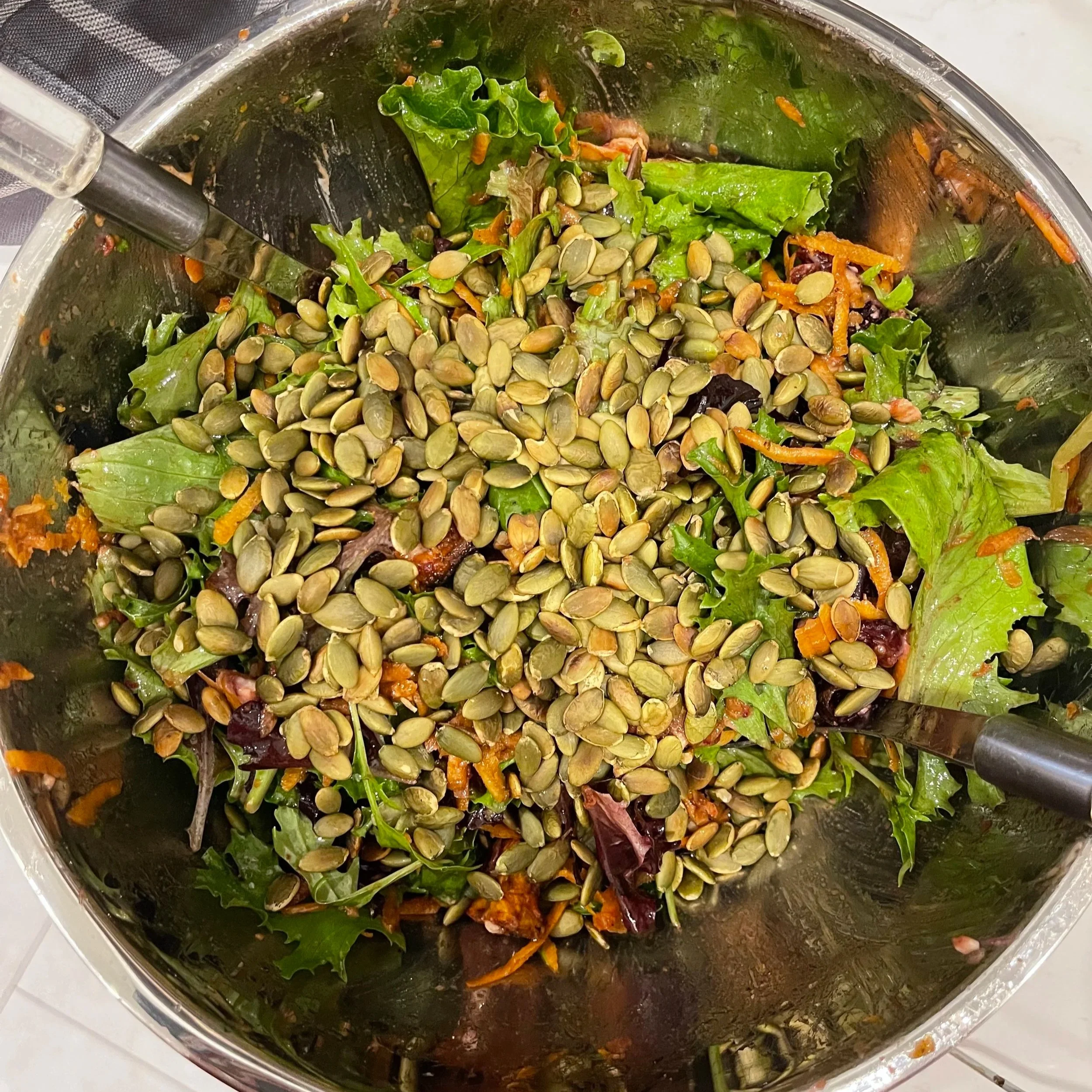 Toast pumpkin seeds: add to pan on med heat and cook until you hear them ‘pop’ and there is a slight golden colour, sprinkle sea salt